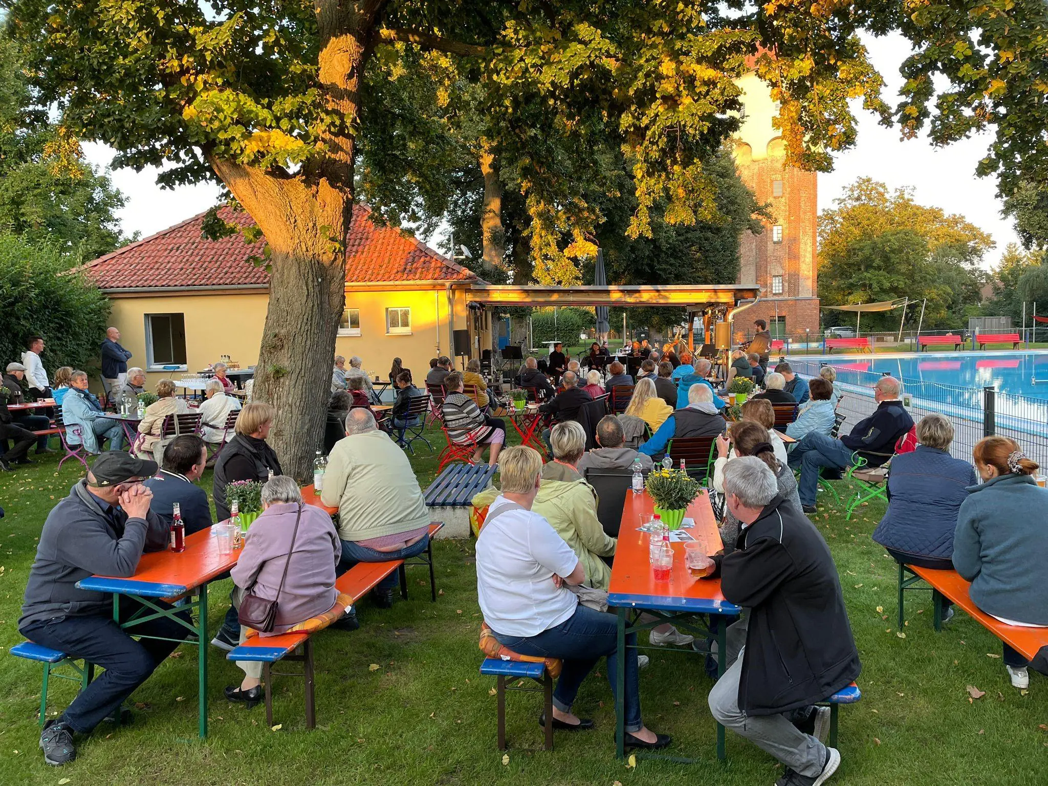 Die in diesem Jahr neu gestaltete Terrasse mit Überdachung und auch die angrenzende von hohen Lindenbäumen umgebende Liegefläche, wurden am vergangenen Samstag in einen kleinen Open Air Konzertsaal umgestaltet. Insgesamt fanden an diesem Spätsommerabend siebzig Gäste den Weg ins Freibad und wurden nicht enttäuscht. Matthias Grund als Vereinsvorsitzender begrüßte die anwesenden Künstler und Gäste und freute sich mit seinen Mitstreitern auf die nun folgenden Darbietungen. Das „Fläming Quartett“ in der Zusammensetzung Iris Block (Cello), Livia Mierisch (Bratsche), Anne Büchner (Violine) und Burkhard Kroll (Violine) hatten viele schöne Musikstücke im Repertoire. Burkhard Kroll erwähnte zu jedem Stück humorvoll die Entstehungsgeschichte, so auch zu „Bei mir bist du schön“ das einst vom Komponisten für 30 Dollar verkauft und anschließend zu einem Welthit wurde. Für den Niemegker St. Johanneschor“ war dieser Auftritt ebenfalls ein Highlight, denn eigentlich ist die Niemegker Kirche für Daniela Geißler (Alt), Annemone Schulze (Sopran), Marlene Grund (Sopran) und Michael Thimm (Tenor) der bevorzugte Auftrittstort.